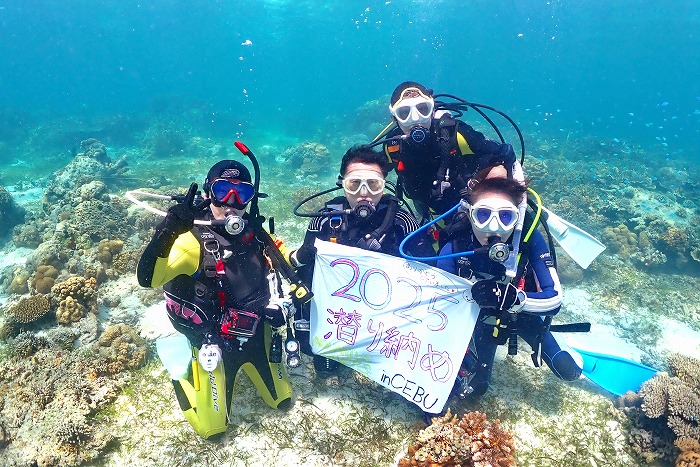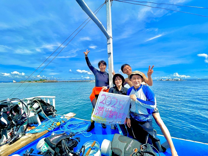 2025年潜り収めフラッグを持って記念撮影。